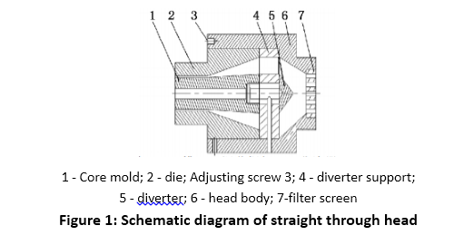 Главата е генерално составена од тело на главата, пренасочувач, потпора за пренасочување, завртка за прилагодување, јадро матрица, матрица итн.глава за истиснување на цевкигенерално се поделени на директно преку тип, тип на прав агол, ексцентричен тип, спирален тип и тип на корпа на екранот. Директната глава е најчесто користена, а нејзината структура е прикажана на слика 1. Главата може да се подели на следните три дела: телото на главата и пренасочувачот го сочинуваат првиот дел од главата, односно делот за преформа; Делот за компресија на потпирачот за пренасочување, матрицата и јадрото го формираат вториот дел од главата, односно делот за компресија; Правите делови на матрицата и јадрото го формираат третиот дел од главата, односно делот за формирање.