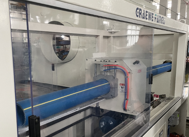 Четврто, цевката се влече од единицата за влечење на гасеницата и се испраќа во секачот каде што цевката е отсечена според претходно поставената должина; во исто време, прашината за сечење се отстранува со отстранувачот на прав.
